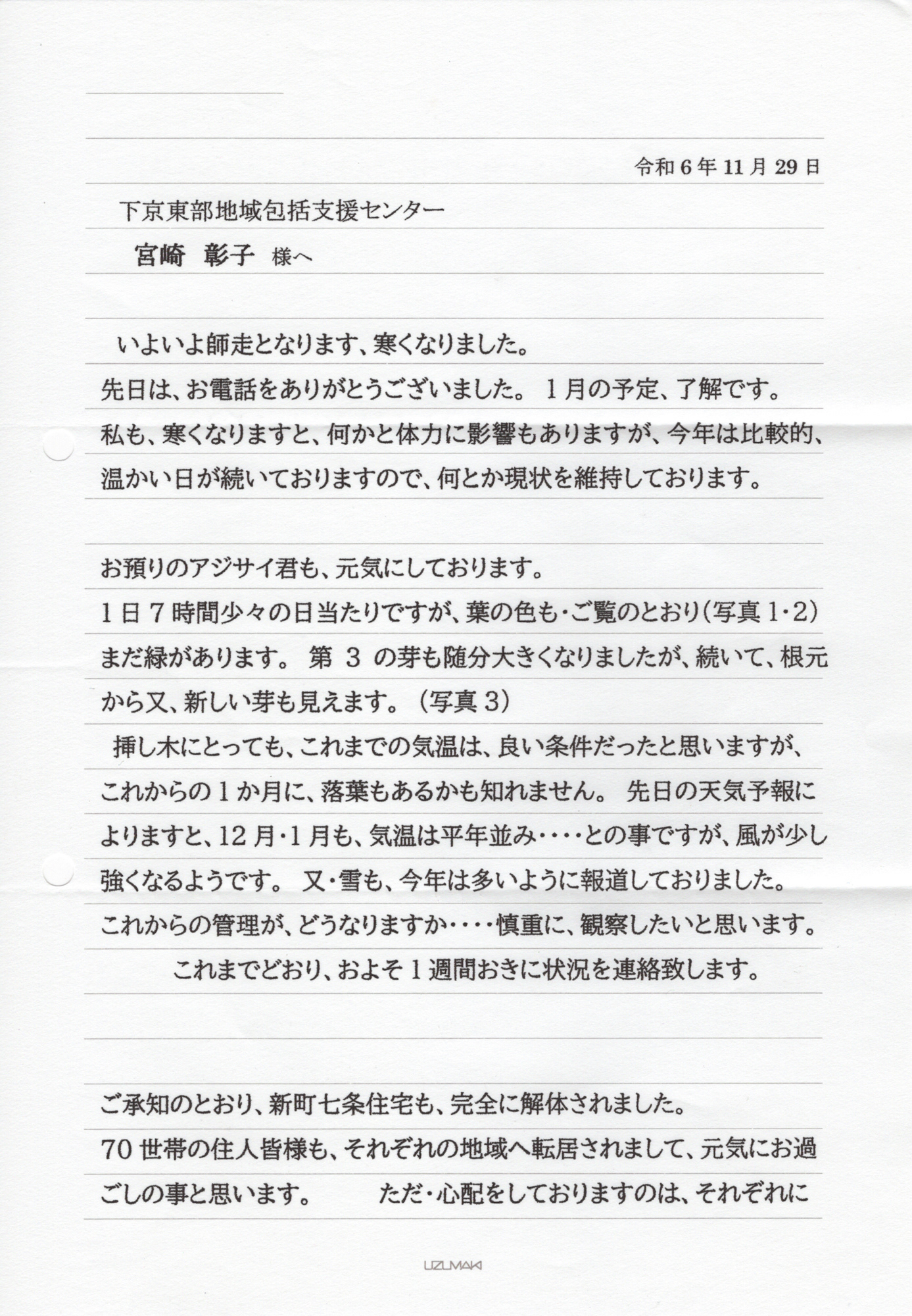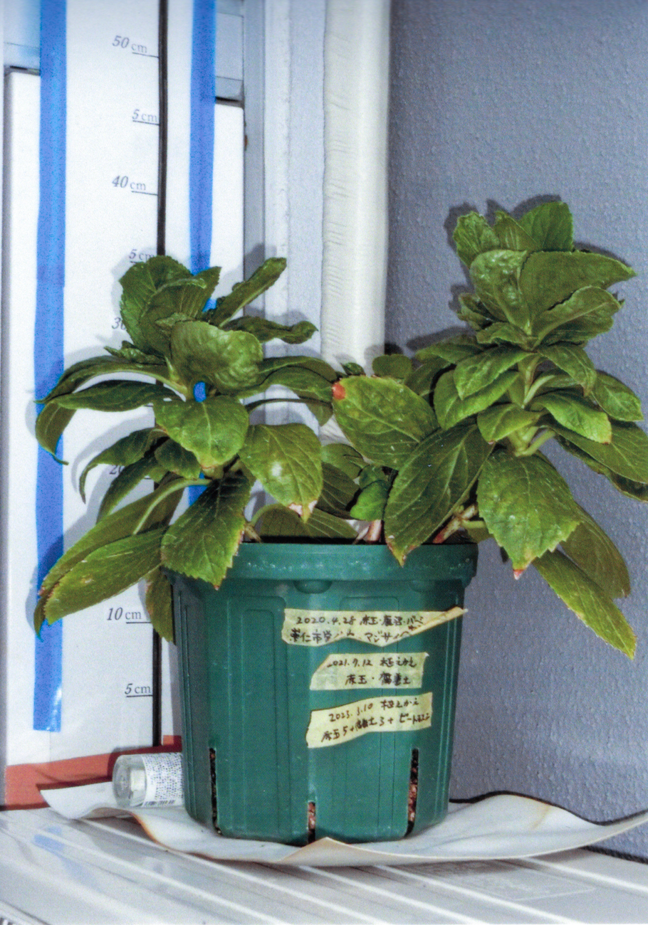 2024年10月23日~2024年1月12日の期間、アジサイ②の挿し木を小川 晃弘さんに預け、小川氏のご自宅にて見守っていただきました。その期間中、小川さんはご自身の方法で挿し木を撮影、見守りの様子を記録し、毎週一回程度、郵便で送って下さいました。
