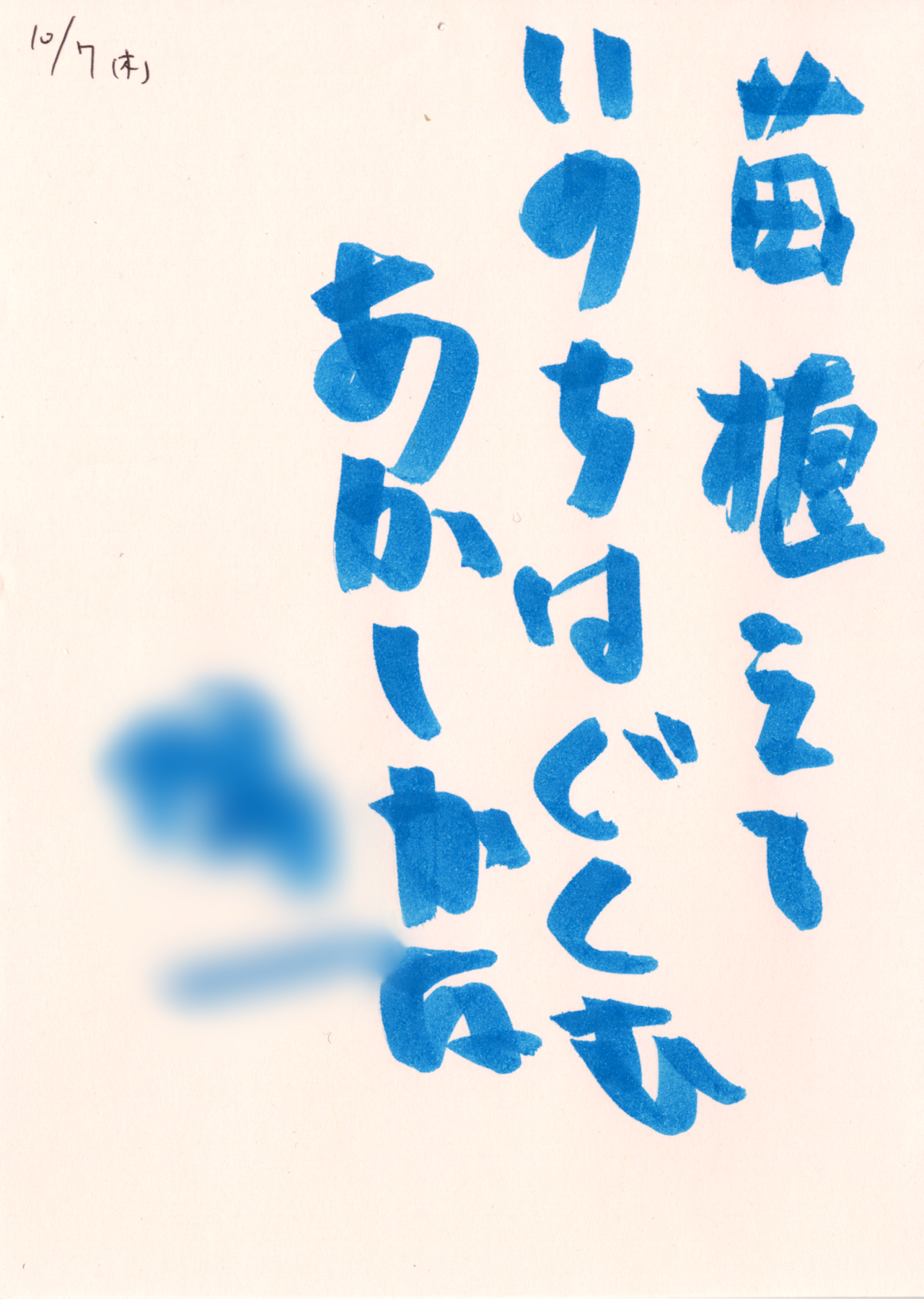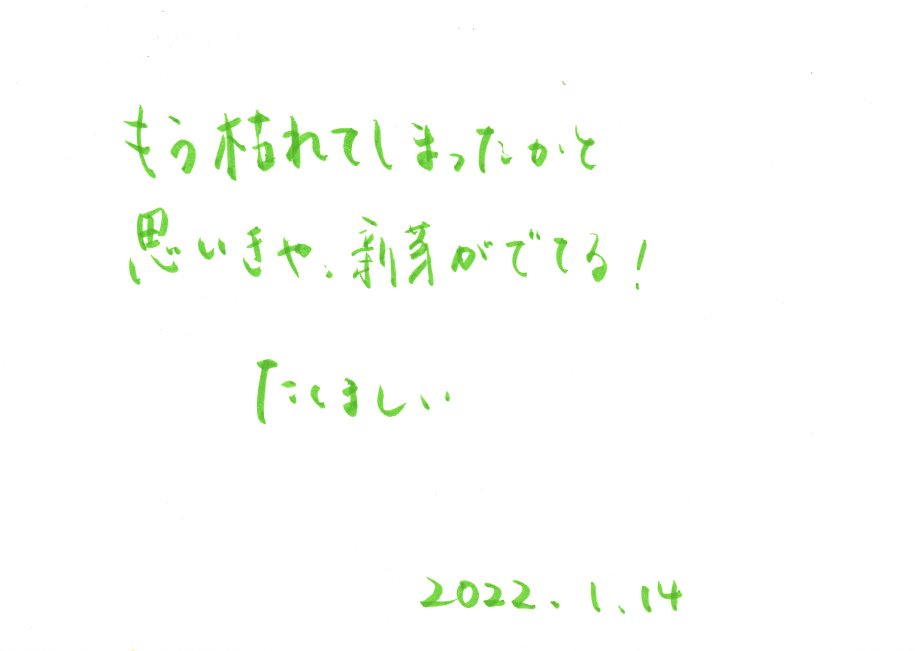 2021年9月28日~2022年2月28日の期間、5本の挿し木を、崇仁デイサービスうるおいの職員さん・ご利用者さんに見守っていただきました。本ページは、その際に職員さん・ご利用者さんが書いてくださった、みまもり日誌を掲載しています。水やりや声がけなど皆さん大切に育ててくださいました。玄関近くで見守っていただいていたのですが、やはり空調管理がされた状態だったせいで調子を崩してしまうものも出てきてしまい、最終的にすべて引き取り、山本の現アトリエ (滋賀県大津市) にて管理を続けました。